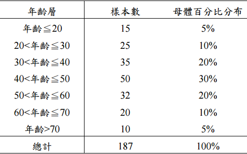 一、某醫療院所想進行所在鄉鎮居民之健康調查,現在考慮樣本之年齡層分布與母體之一致性,請依下列資訊計算並回答問題。
