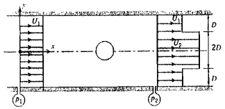 1. 一直徑為D具有礼隙的圓柱體,置於高度4D與寬度W的均勻矩形裁 面風洞内。圓柱體延伸至與風洞同寬。圓柱體流出每单位,寬度上體積流 率為Q的空氣。流場為穩態及常密度。進口與出口裁面上分別為均勻 壓力p