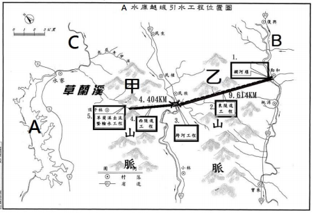 八、八八水災受創最嚴重的是 A 水庫越域引水工程所經 鄉、村,當地居民、專家學者、媒體均有聲音質疑 A 水庫越域引水計劃是重創災情的幫兇。此引水工程 計畫在高雄縣桃源鄉勤和村興建攔河堰,並以鑽炸 方式開挖穿越山脈的東隧道、西隧道,共長 14 公里, 以便引用高屏溪上游溪水。右圖為越域引水的工程 簡圖。請問: