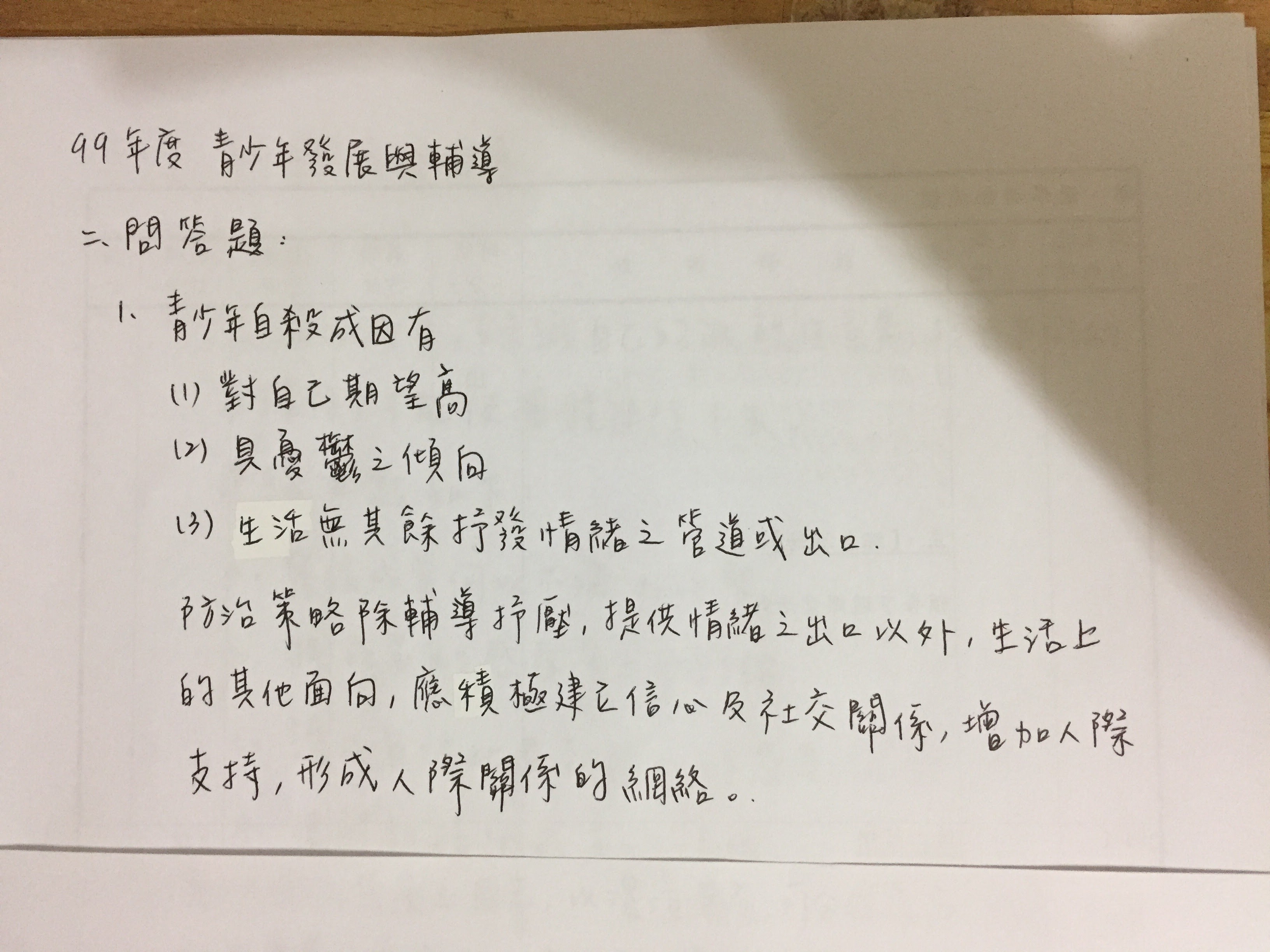 青少年自殺的問題已是社會上重要的議題,更說明在教育上需要特別留意,而以下將說明其成因及防治策略: ㄧ、成因 (1)人格問題:青少年本身具有憂鬱傾向,或缺乏適當的溝通、情緒調解方式,以致長期累積負面情緒以及低度自我價值感。 (2)家庭因素:父母若是以高壓管教的方式,使親子間缺乏溝通、良性互動,甚至一味地給予青少年壓力,沒有去了解青少年想法、能力,例如:一定要保持前三名。 (3)同儕因素:遭受到同儕團體的排擠、嘲諷......等霸凌行為,而又因為害怕使其不敢求助,造成長期累積心理創傷。 二、防治策略 (1)需要留意班上同學是否不尋常的行為,或是在週記上有透露出需要幫助的訊息,主動去關心。 (2)教導合理的情緒調解方式:可利用班會時間進行宣導。 (3)重視班級合作、互助