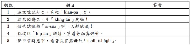 第二部份:書寫漢字(請照《臺灣台語常用詞辭典》的規範用字寫出題目拼音的漢字)(每 題 2 分,共 10 分)