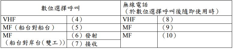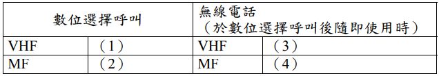 五、船舶進行遇險、緊急、安全及例行(Distress, Urgency, Safety and Routine)初始呼叫 (initial call)時,應依下列表格之情況說明其使用的無線電設備之發射頻道或頻率分別為何(請書寫於試卷上)?(20 分)