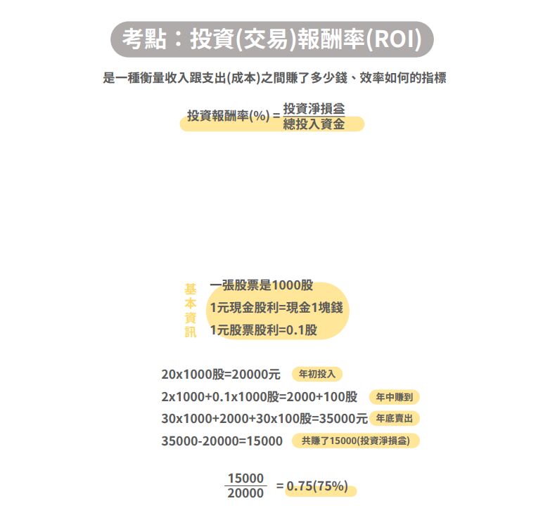 成本20000元獲利:現金股利2000元配股1元(+100股)=1000股>1100股年末賣出價30元*1100股,總收入3300033000+2000=35000報酬率35000-20000/20000=0.75