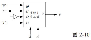 10. 圖2-10所示為利用4對1多工器所設計的邏輯電路,其中,輸入信號為CBA,試求輸出F最簡化之布林函數F = ________________