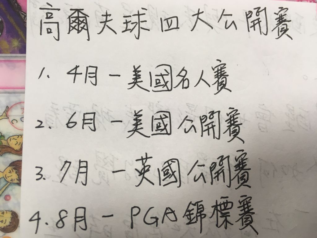 美國名人賽4月 美國公開賽 6月英國公開賽7月 PGA錦標賽8月