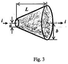 4. In Figure 3, current is set up through a truncated right circular cone of resistivity ρ, left radius a, right radius b, and length L. Assume that the current density is uniform across any cross section taken perpendicular to the length. (a)What is the resistance of this cone? (11)_______ (represented with ρ, a, b, and L.) (b) This cone was made from copper material. Taking ρ = 1.69×10⁻⁸ Ω·m for copper at 293 K, left radius a= 0.20 mm, right radius b= 0.60 mm, and length L = 10.0 cm, calculate the resistance of the cone. (12)_______ (c) Taking the temperature coefficient of resistivity, α = 4.3 × 10⁻³ K⁻¹ for copper, re-estimate the resistance at 400 K. (13)_______. [Hint: ρ= ρ₀(1+α·ΔT), where ΔT is the change of temperature.]