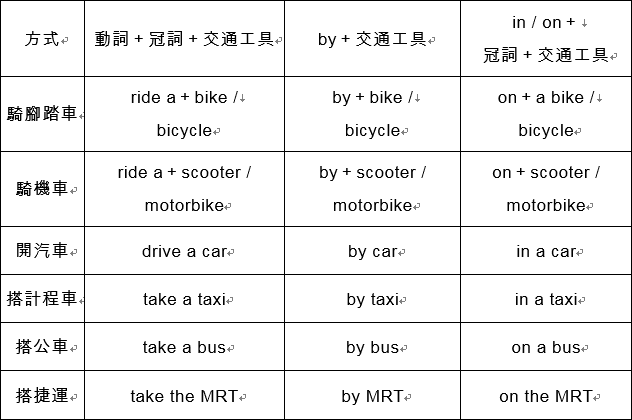 要點一:take the MRT搭捷運 「搭乘交通工具」的講法也是試場上常考的要點,你可以用「動詞+冠詞+交通工具」、「by+交通工具」或者「on / in+冠詞+交通工具」三種方式表達,詳見下表: