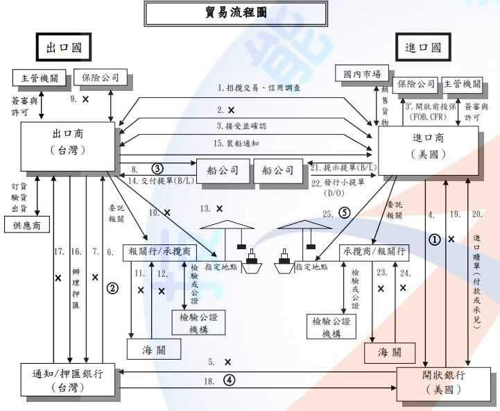 請依下列之貿易流程圖,依序將①②③④⑤之步驟名稱填入答案紙之答案欄內。 (本測試項目評分依公佈範例為準)