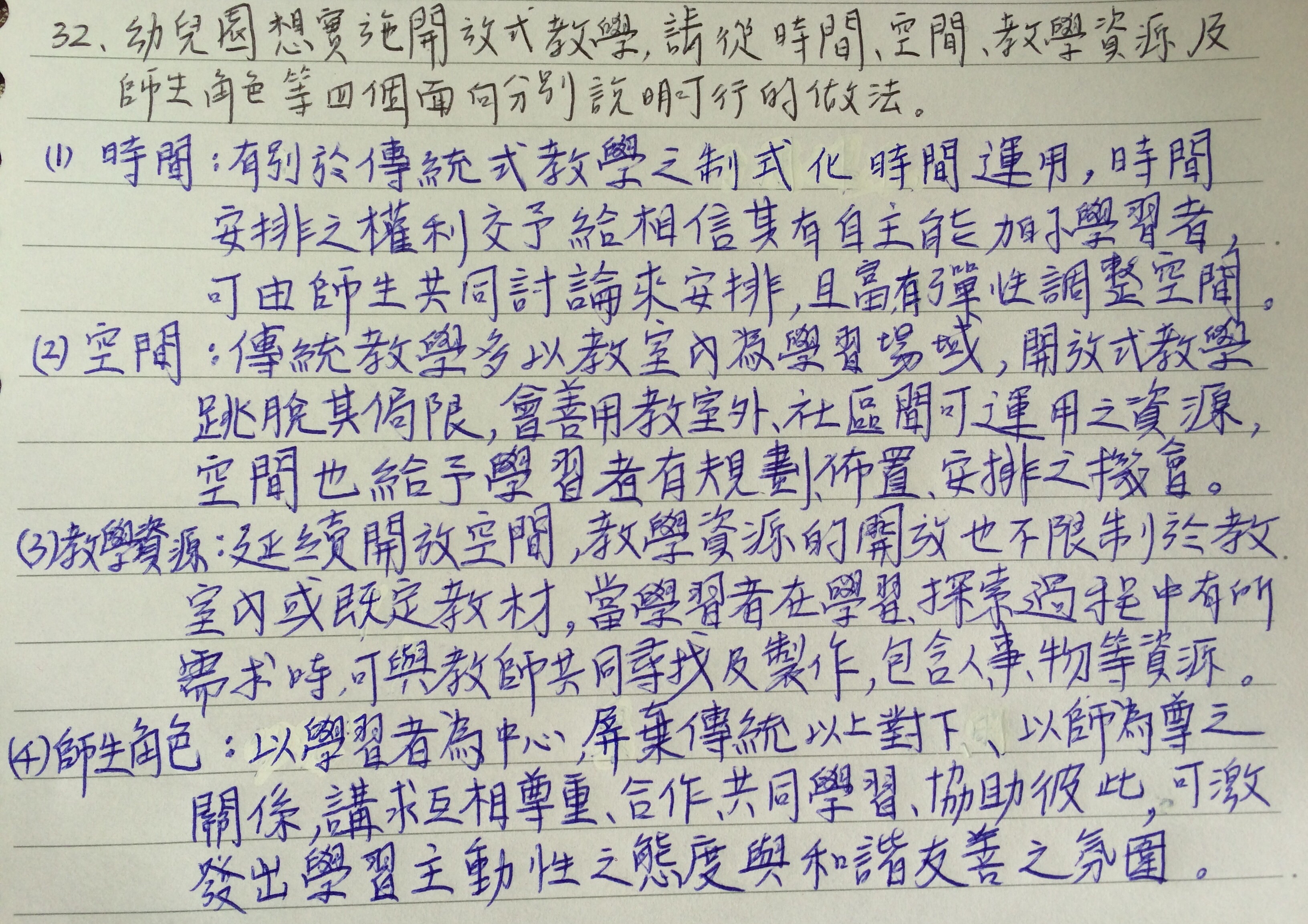 幼兒園想實施開放式教學,在時間、空間、教學資源及師生角色等四個面向茲分別 說明可行的做法: