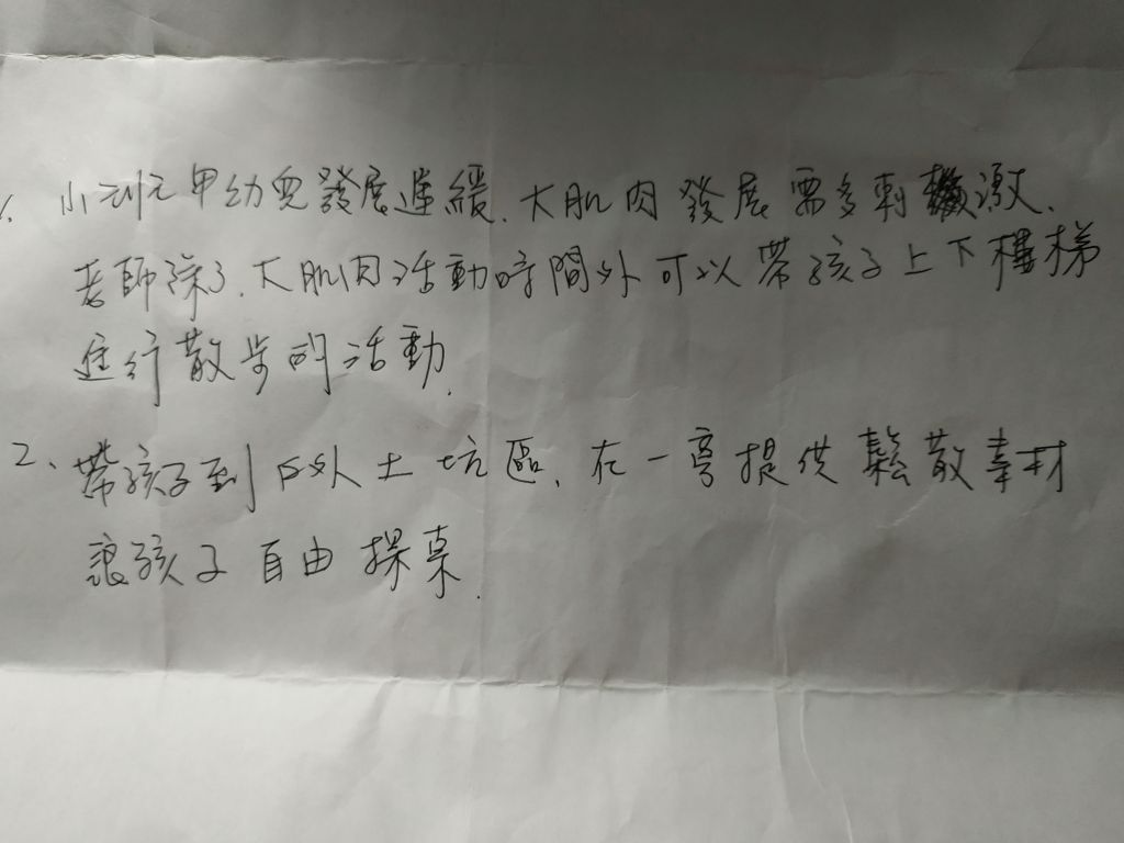 以學習區為例,在學習小肌肉技巧上,需先從控制手腕力量開始,例如小班時先運用舀、握、抓等方式拿取素材,大班時再加入拼豆、縫工等活動。