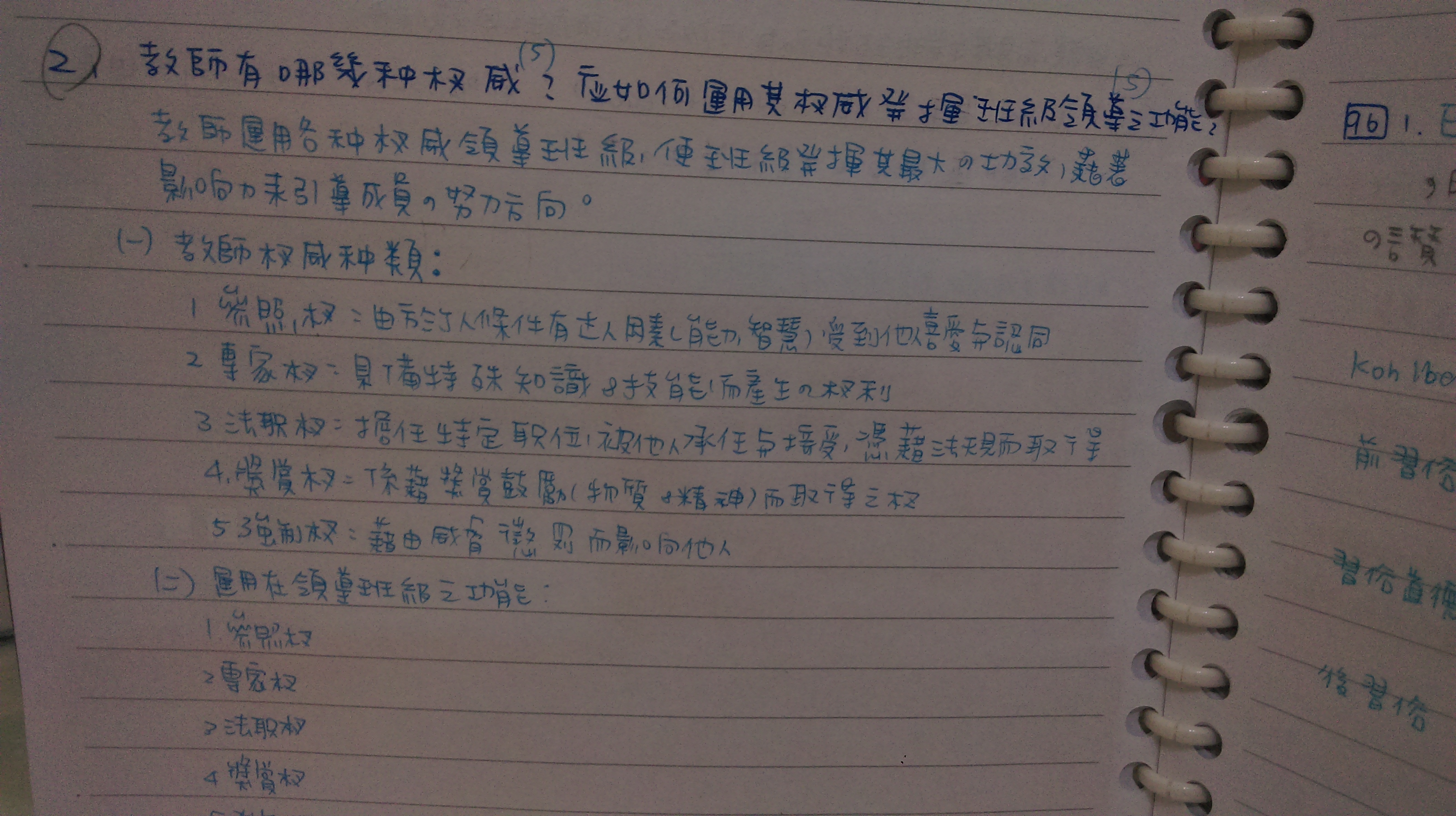 (一)教師有以下五種權威: 1.法職權威 2.獎賞權威 3.強制權威 4.專家權威 5.參照權威 (二)善用權威,能夠有效發揮班級領導,作法如下: 1.初進入班級,善用法職權威,確立教師在班級中的主導者角色。 2.善用獎賞權威及強制權威,建立生活常規運作的模式。 3.運用專家權威,透過教學理念的實施,營造一個利於學習的環境 4.運用參照權威,以身作則,使學生有楷模可以學習。