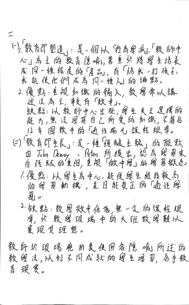 二、 教育即生長,學生如同一枚種子,教師則是園丁,負責灌溉以及修剪,目的在於輔助學生生長,其優點是將學生當成有自主意識的學習者,缺點則是忽視教育並非死板的生命命定歷程,生長不應有終點,而是因持續精進已達至善,