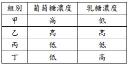環境中存有葡萄糖時,大腸桿菌會優先利用葡萄糖, 因此參與葡萄糖代謝的基因會持續且快速的表現,甚至乳 糖存在時,乳糖操縱組結構基因表現也不高,需要經由一 種 CAP (Catabolite Activator Protein) 的活化,然而 CAP 的活化與 cAMP 的濃度有關。若將大腸桿菌放置於右表 甲~丁四種不同培養環境, Lac Operon 的表達也會有所 不同。