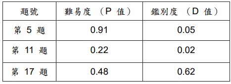 六、 你正在審閱一份高三生物科段考之測驗結果,該測驗包含 30 題選擇題。下表為其中三題的試題分析數據,請 回答下列各小題: