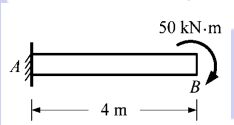 第三題 如圖所示之受載梁,其中梁長度為 4 m,A 處為固定支座,B 處為自由端且受 集中彎矩 50 kN.m 作用。假定撓曲剛度 EI 為恆定,若考慮以直接積分法 (direct integration method)進行分析,並取 A 處為座標原點,試問: