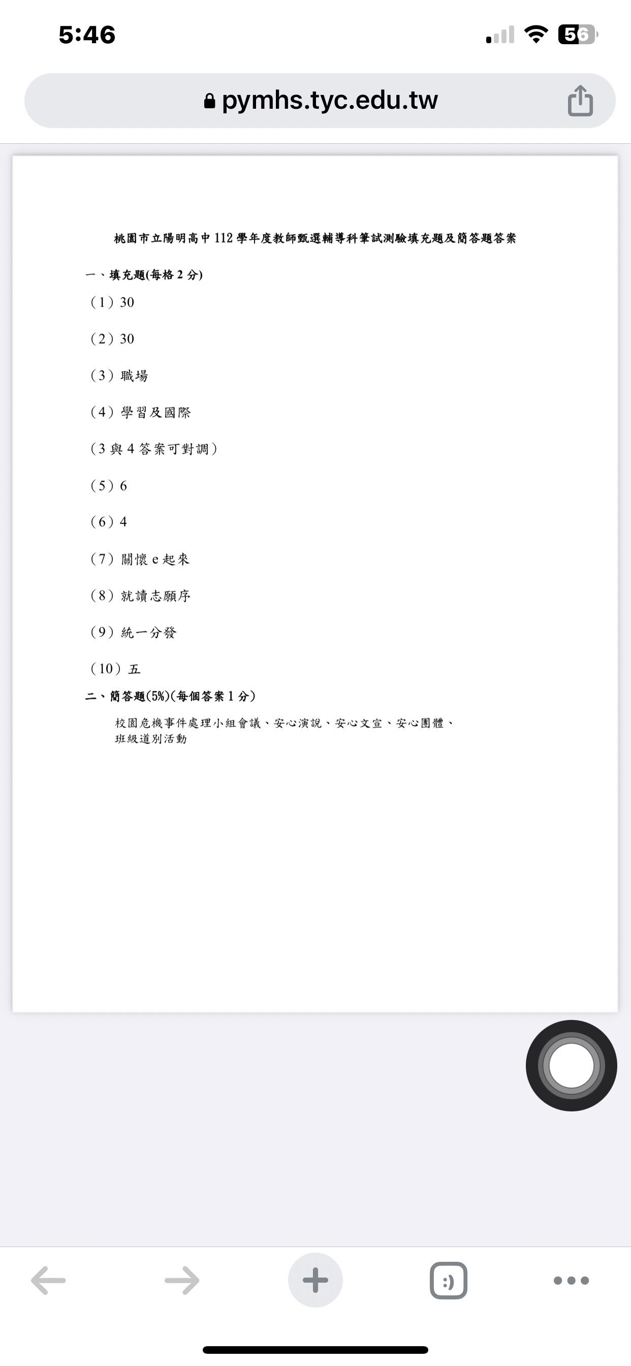 試卷:112年 - 112 桃園市立陽明高級中等學校教師甄試試題:輔導科#114462