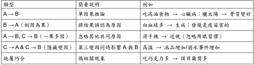 四、 在生物教學或探究實作中,學生常見因果推論錯誤,將「相關現象」誤解為「因果關係」。下表為五種不同推論邏輯類型,常見於課堂教學與學生迷思中,請參考此表並回答下列各小題。