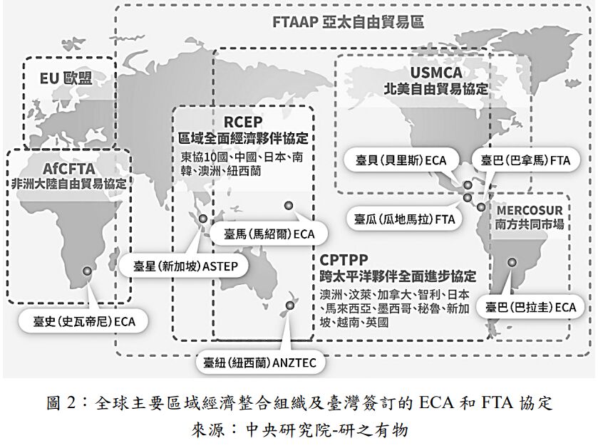 四、全球化潮流下,多邊經濟體系(如 WTO)面臨瓶頸,區域經濟整合則逐漸變成主流,ECA/FTA 在 全球貿易體系的重要性不斷提升,而臺灣目前不在任何一個區域貿易組織內,為了不喪失在國 際市場上的競爭力,自 2002 年加入世界貿易組織後,近 20 年來陸續與多個國家簽訂 ECA 或 FTA(圖 2)。請回答: