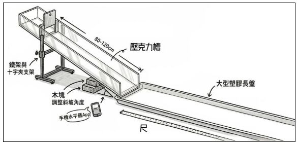 小星與大雄兩位同學對於這個主題很有興趣,經過討論後他們決定探究主題為:有哪些因素會造就土石流?他們覺得有可能的變因為:土石含水量、土砂的比例、斜坡的傾斜度,因此他們想以固定土的體積下,探究土砂的比例、斜坡的傾斜度,這兩種變因對土石流移動距離的影響。於是他們設計了一個模擬土石流的裝置。 試回答以下問題: