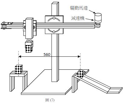 如下圖(7)為一T型搬運模組,已知條件:1.輸送帶輸送距離560 mm,2.全程輸送時間3.5 sec,3.皮帶的等效負載(水平方向)為10 kgf,4.驅動馬達的轉速,若為1152 rpm,5.如T型搬運模組定位精度要求在1.0 mm時,使用時規皮帶傳送、時規皮帶齒輪的周節為6 mm、齒輪齒數25齒。