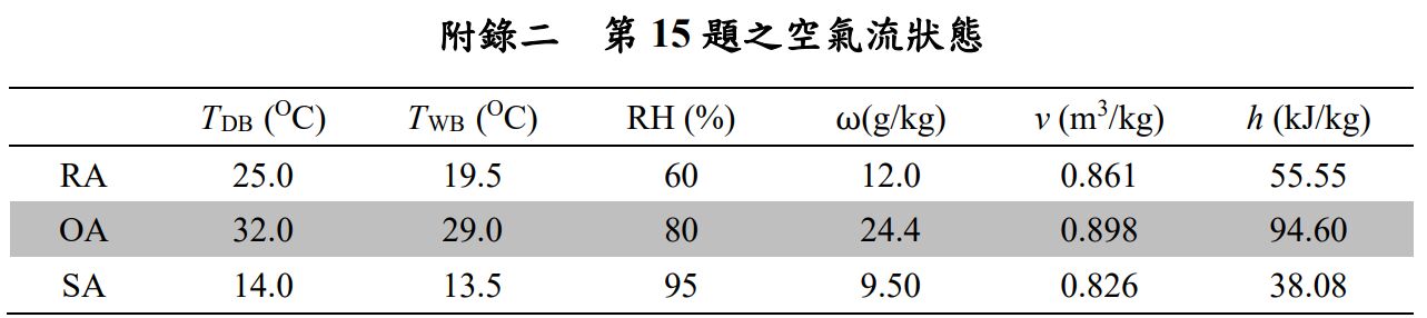 空調機之回風口 RA、外氣 OA 及出風口 SA 的狀態如附錄二所示