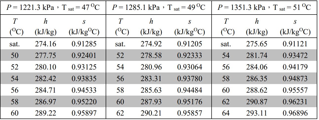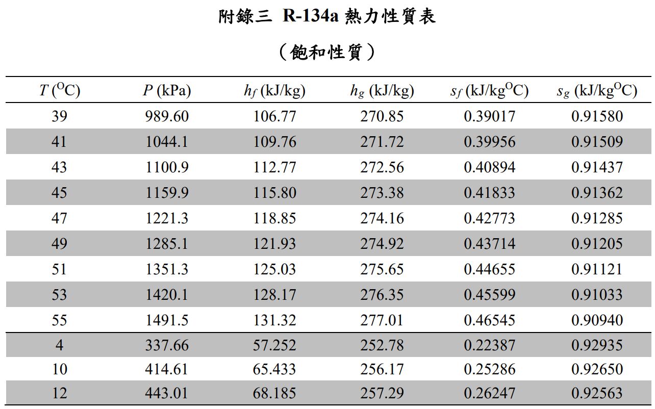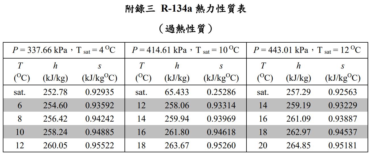 (R-134a 熱力性質表摘錄如附錄三所示)