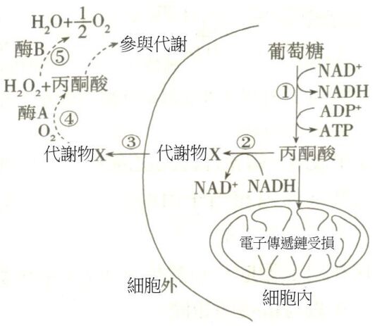 人類粒線體電子傳遞鏈受損可導致代謝物X的累積,由此引發多種疾病。動物實驗發現,給電子傳遞鏈受損小鼠注射適量的酵素A和酵素B溶液,可發生如下圖所示的代謝反應,從而降低粒線體電子傳遞鏈受損導致的危害。請依圖回答第26~28題: