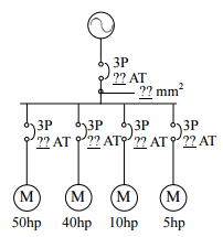 一、某工廠電力系統有一幹線供應四具三相 440V 鼠籠型感應電動機如圖所示,假設其 額定容量及全載電流分別為 50hp、63A;40hp、52A;10hp、14A 及 5hp、7.1A,均 無起動階級代號。採用 Y-△起動器作為操作器,各電動機不同時起動,分路及幹線 均用斷路器作為過電流保護器。如採用 PVC 電線,按金屬管配線,試依表一與表 二所提供之電線與斷路器規格,求: