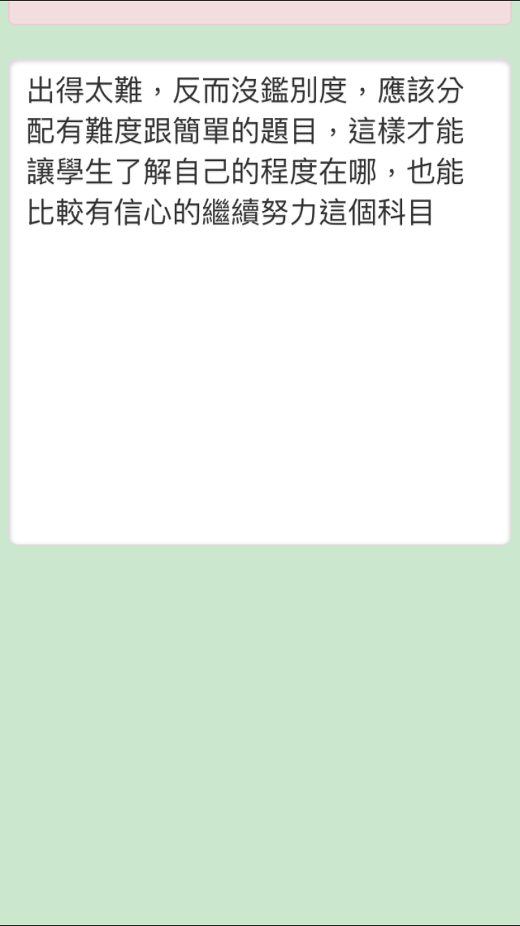 出得太難,反而沒鑑別度,應該分配有難度跟簡單的題目,這樣才能讓學生了解自己的程度在哪,也能比較有信心的繼續努力這個科目