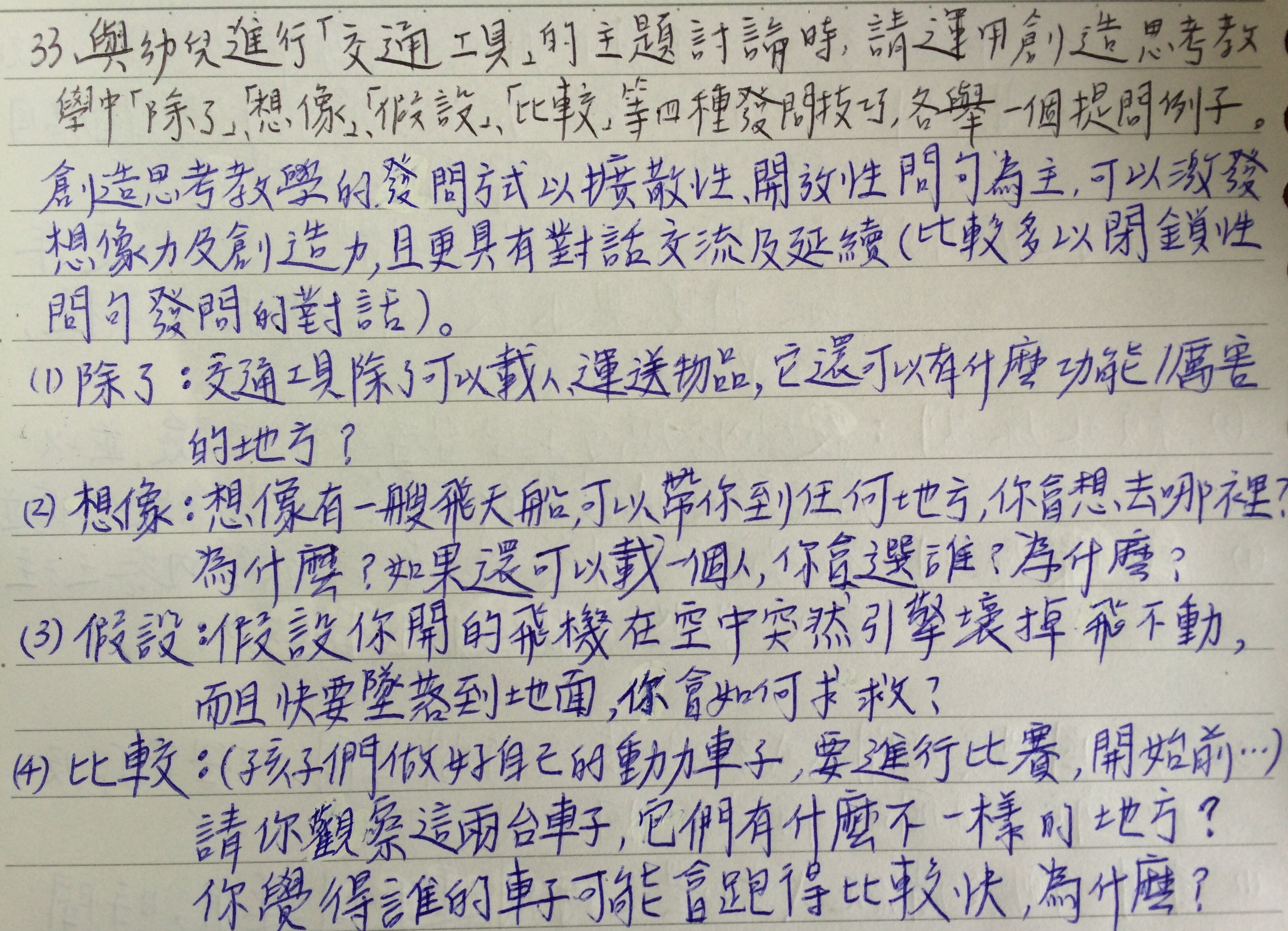 創造性思考可透過老師對學生的提問或是對話引導幼兒進行多樣思考,透過多種發問技巧可增進其流暢性、獨創性、精進性、變通性等,以下依「除了」、「想像」、「假設」、「比較」四種發問技巧舉例: