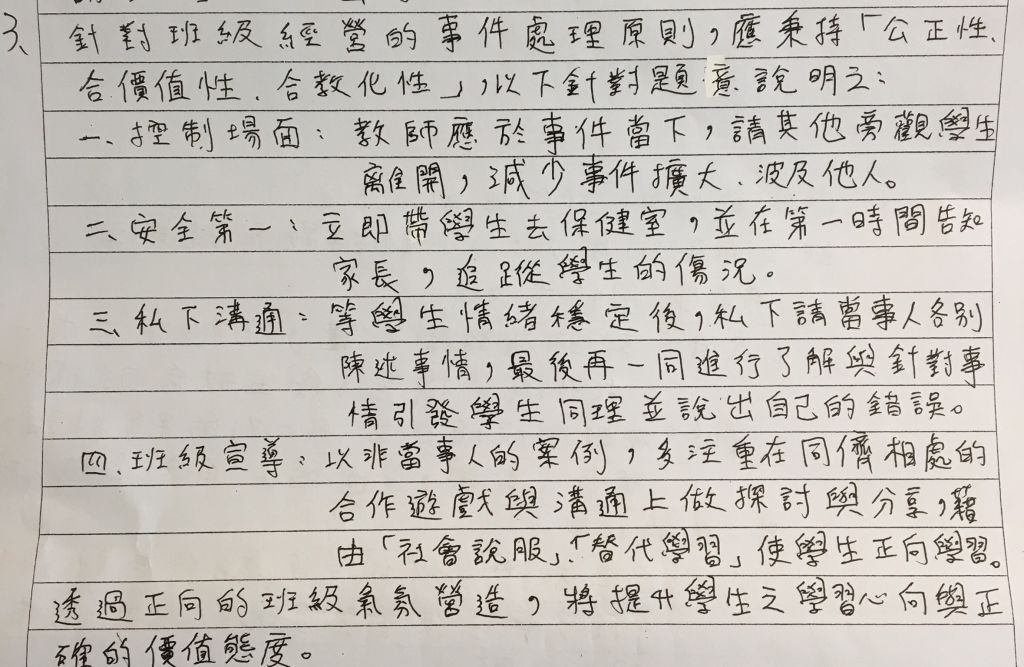 (二)個別輔導:涉及此事件的三名學生進行個別輔導,聆聽學生的想法並了解其行為背後的原因,適時教導並給予正確的交友及處理人際衝突之觀念。