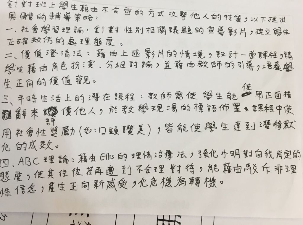 4.在班級實施反霸凌宣導,提及只要當事人感到不愉快,都構成霸凌的定義,並模擬道德選擇環境,使學生建立道德觀。