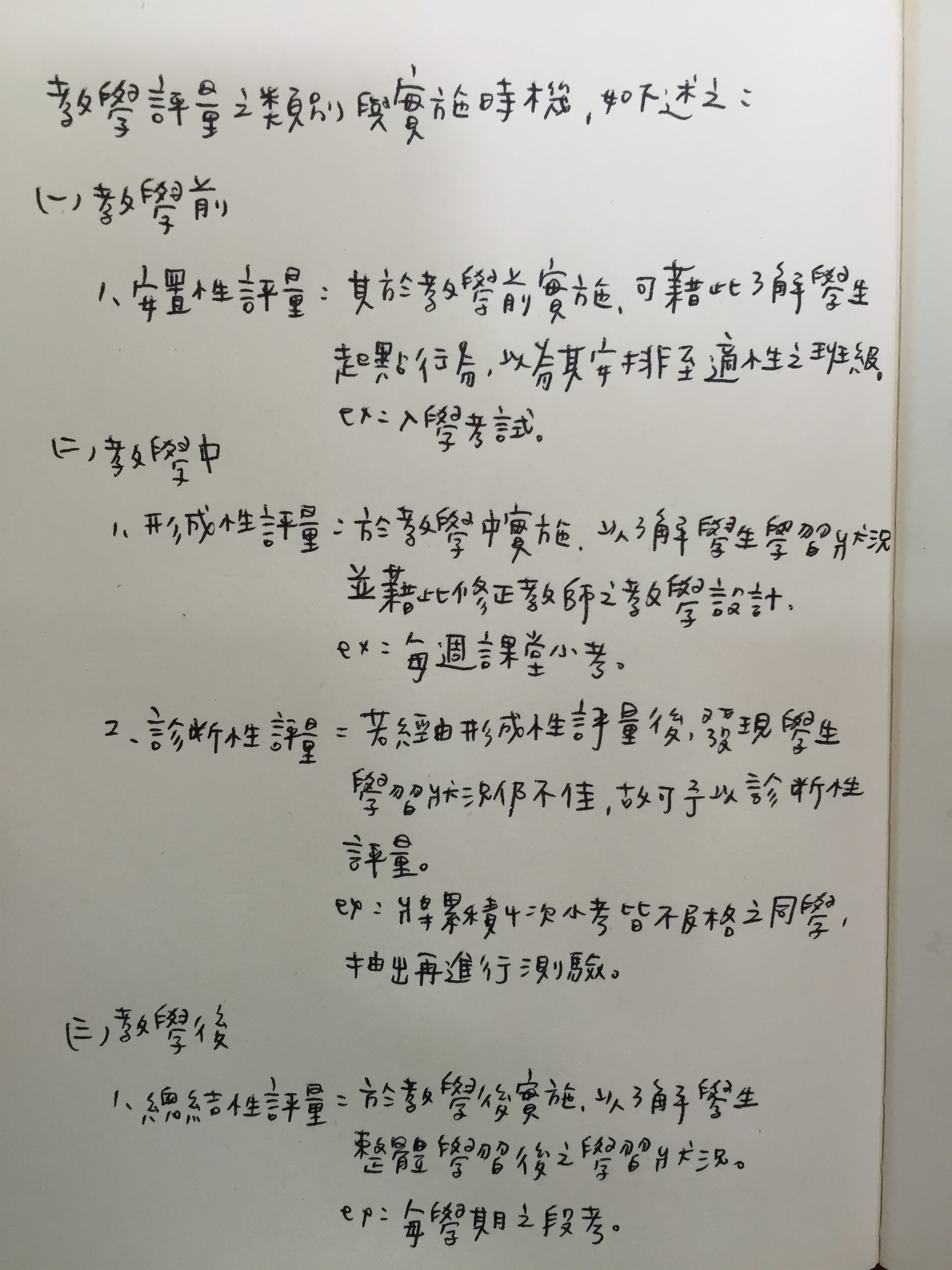 1.形成性評量:在教學活動當中,對於教師的教學及學生的學習表現的評量。如:小考。