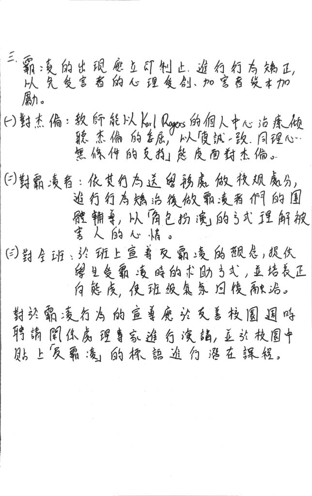 ((1))運用羅傑斯的個人中心治療:教師可以施予無條件的正向關懷與同理心,來安慰杰倫的心靈傷害,讓其可以受到關心與關愛。
