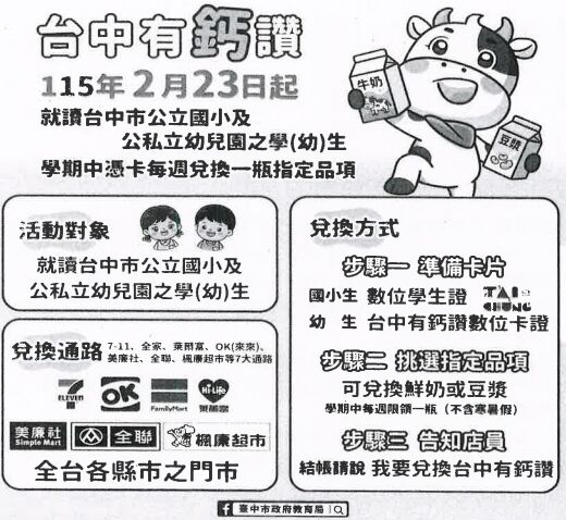 資料三: 經過一年多的混亂,歷經政策停辦、地方政府接辦、冷鍊問題的磨合,現今多數縣市以學生持數位學生證親至超商(如台中市新聞圖卡),一周一次靠卡領取鮮奶或豆漿;但此政策仍引發後續許多問題待解決。