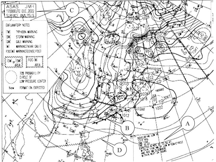 3. ( C )箭頭所指的氣象傳真圖之種類,及其說明(全文如下)的意思?ASAS, JMH, 170000 UTC, DEC. 2022, SURFACE ANALYSIS