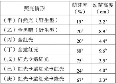 33.實驗針對野生型及突變體牽牛花種子,進行不同光照的處理,已知(甲)和(乙)光照處理的是野生型。若以照光而言,自然光、紅光、遠紅光都屬光照的一種,右表是連續光照5天後的結果;其中萌芽率或幼苗高度數值旁所標記的a、b代表統計分析的結果,相同字母(a和a;b和b)者代表組別之間無顯著差別,不同字母者(a和b)代表組別之間有顯著差別。由右表的結果,判斷下列敘述哪些正確?(A)自然光照下,直接播種牽牛花種子於土壤表面,可使其大量萌芽(B)丁項處理的牽牛花種子可能是突變體(C)由戊和己可知,光敏素參與種子萌芽的調控(D)於黑暗下,加照綠光不會影響幼苗的高度(E)光敏素不會促進種子的發芽。