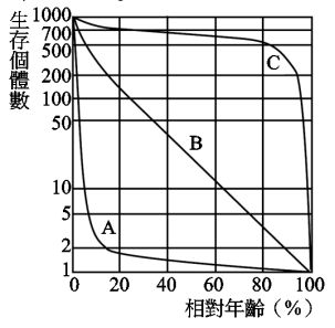 下圖為A、B、C三種動物的生存曲線圖,請依圖回答第35~37題: