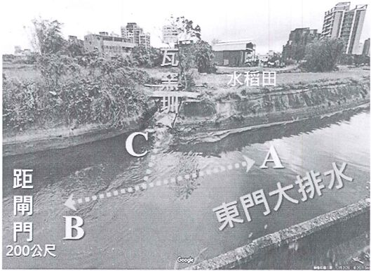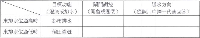 1.請依據以上「東排」分布地圖及照片(照片左端為閘門位置),回答表格中的六個答案: