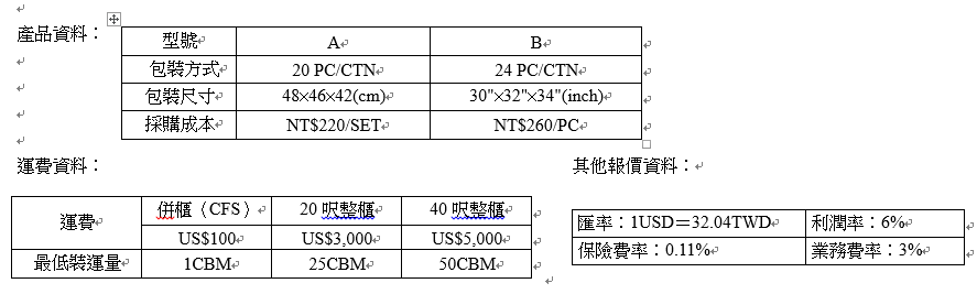 四、出口價格核算(本題共10小題,每小題3分,合計30分) 根據以下資料,對貨號A與貨號B兩種以體積噸計算海運運費的貨物,分別以併櫃與整櫃運量,核算相關運費與報價。 產品資料: