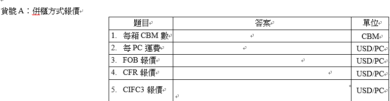 注意事項: 1. 核算要求:計算過程無法整除者,CBM計算至小數點第4位,四捨五入後取3位; 其餘請計算至小數點第3位,四捨五入後取2位。 2. 佣金計算方式:以所求報價條件本身為佣金計算基礎,如FOB&C與CIF&C分別 為FOB與CIF為基礎之含佣價。