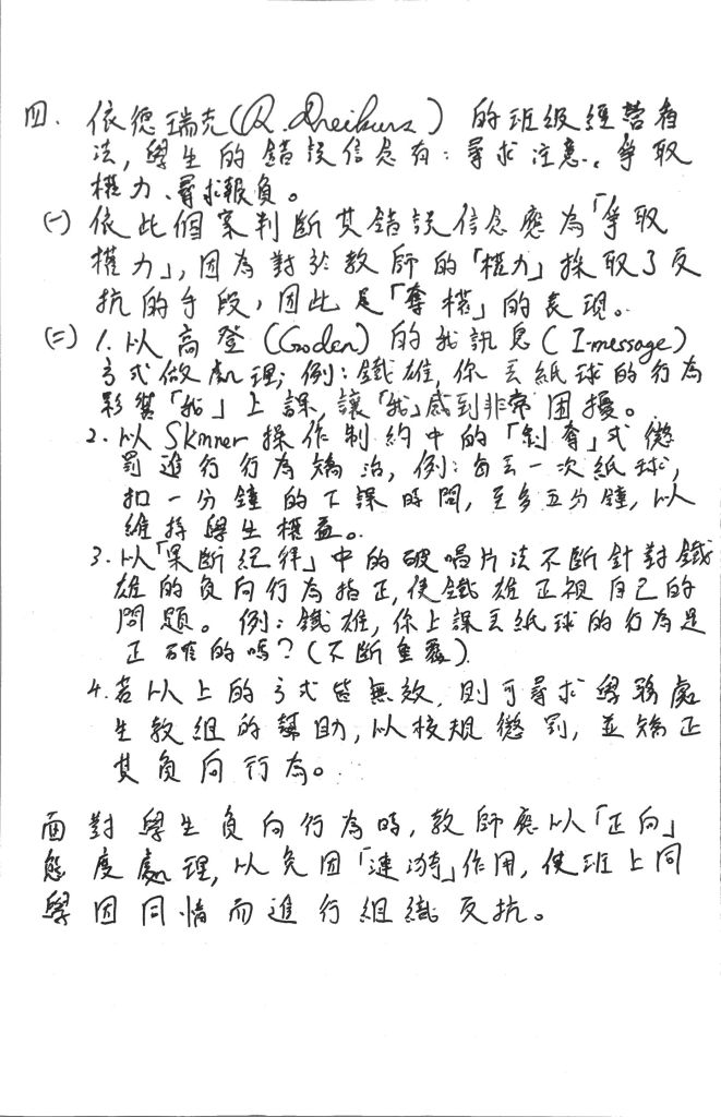 4.老師可利用班上之社會結構,即以同儕之間的互動,表達對鐵雄人格的肯定,也藉由人際關係的建立,使鐵雄的優點被周知;不適切的行為也會被團體的壓力而制止。