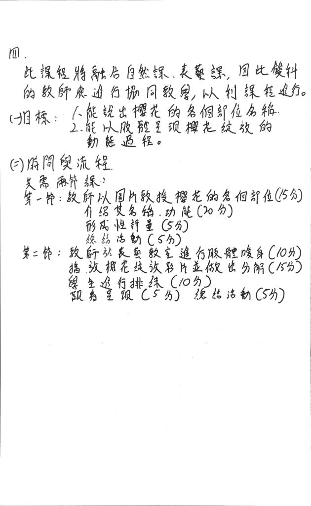 一、教學目標 1.學生能寫出自己對櫻花林之美的感受 2.學生能畫出自己眼中的櫻花林 二、教學時間:兩節課 三、教學活動流程 (一)準備活動 引起動機:第一節課前半小時,先帶學生實際到櫻花林遊賞 (二)發展活動:結合國文和藝術與人文學科 第一節課後半小時,請同學一邊遊賞,一邊畫下自己眼中的櫻花林,並佐以文字說明自己的感受。 (三)綜合活動 第二節課整堂課,請同學回到教室,先與小組同學分享,再一個個上台發表自己的畫作和文章。