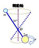 4. 質量為 m 的甲球與質量為2m的乙球分別固定在一長為d的細桿兩端。設細桿極輕,其質量可以忽略不計,且兩球的直徑與桿長相比極小,也可以忽略不計。設轉動軸經甲與乙的質心 O,與細桿夾 30°。乙球繞轉動軸作圓周運動的速率為v,如圖所示。在甲球與乙球的質心 O,看甲球與乙球的角動量總和的量值為何?