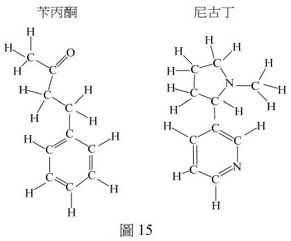 植物的花蜜富含香氣,可吸引某些鳥類前來取食。鳥類吸取花蜜之時,身體會接觸到花蕊與花粉,間接幫助植物授粉及繁衍後代。研究發現某野生菸草,其花蜜的主要成分為具香氣的苄丙酮與具毒性的尼古丁,兩者結構式如圖15。
