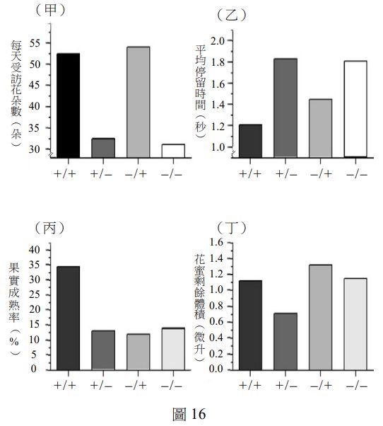 然後,將這三型基改菸草與野生型菸草分別種植在不同樣區,於菸草開花期間同步記錄各區每天受蜂鳥到訪的花朵數目(圖16甲)、蜂鳥在每朵花停留時間的平均值(圖16乙)、果實之成熟率(圖16丙)與花朵中花蜜剩餘的體積(圖16丁)。
