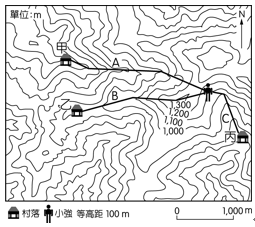 ◎小強登山不幸迷路,經打電話求救後,得到下列指示:從現在位置往東下到河谷,然後沿河谷前進即可抵達某村落。請問: