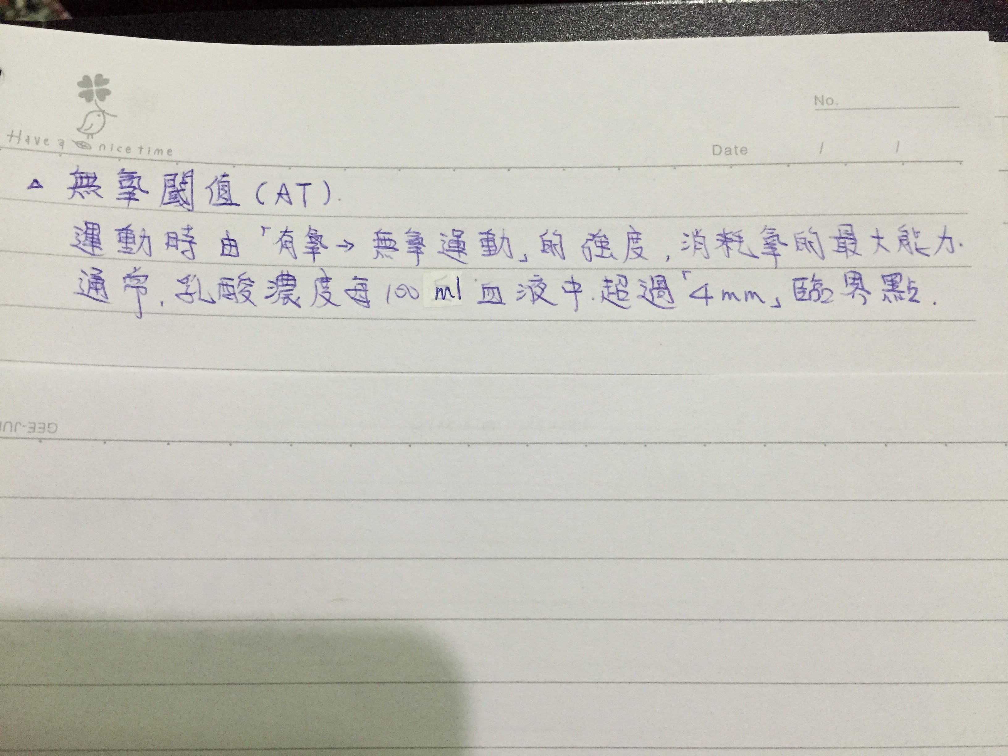 為耐力指標之一,當運動強度到達一定程度時,能量供給從有氧開始轉變成無氧,血液中乳酸開始快速累積的轉折點,也可稱為乳酸域值,4mm/L
