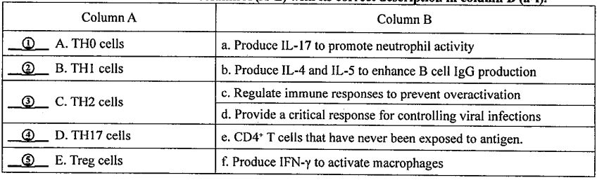 三、配合題(每題5分,共20分) 1. Match the CD4+ T cell subset in column A (A-E) with its correct description in column B (a-f).