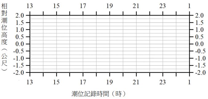 50.請在以下坐標格線中,標示表9中13、15、17、19、21、23時及次日1時的相對潮位高度,並將各點連線,由此觀測資料可推知此處的潮差是多少公尺(須列出計算過程)?(於答題卷作答)